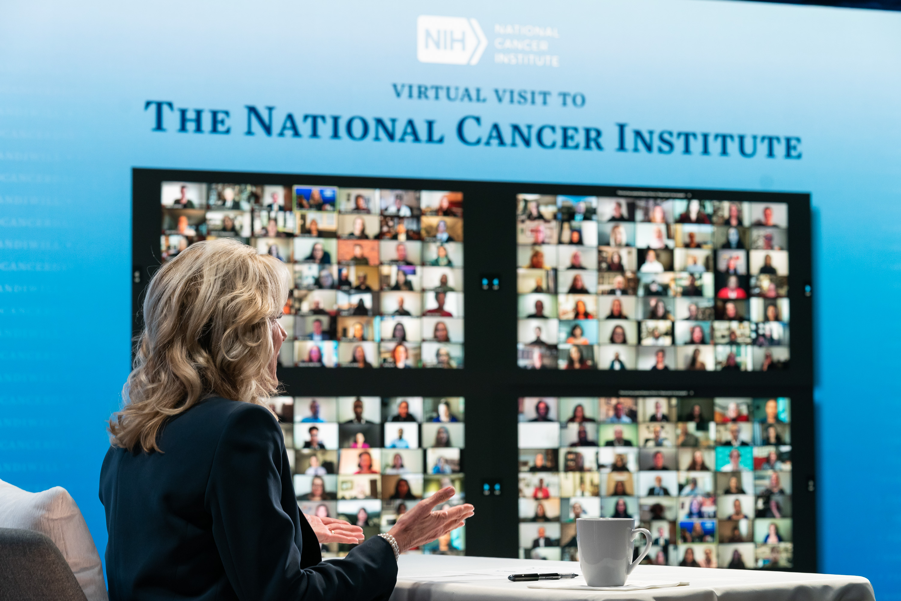 First Lady Jill Biden participates in a virtual visit with researchers and scientists from the National Cancer Institute and National Institute of Health to mark World Cancer Day.