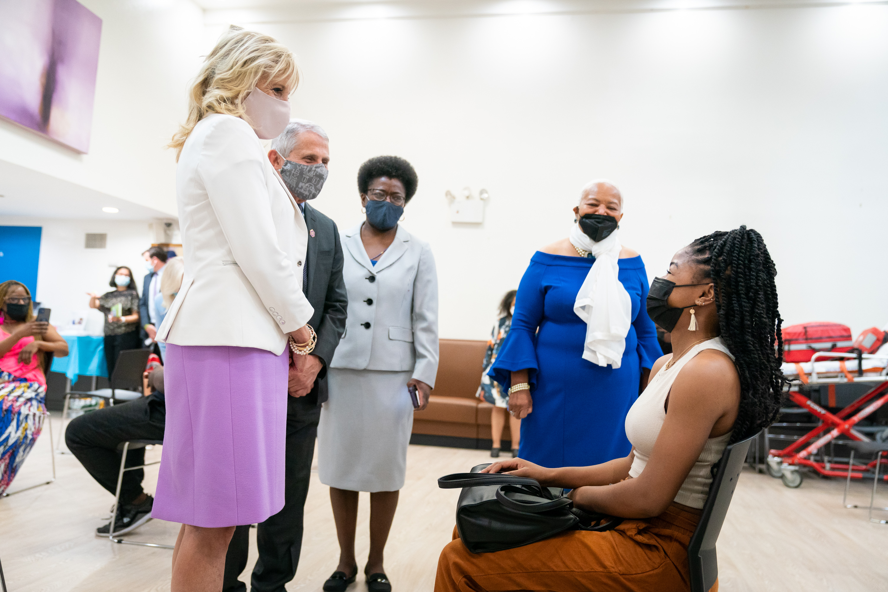 First Lady Jill Biden and Dr. Anthony Fauci visit a COVID-19 vaccination site at Abyssinian Baptist Church in Harlem, New York.