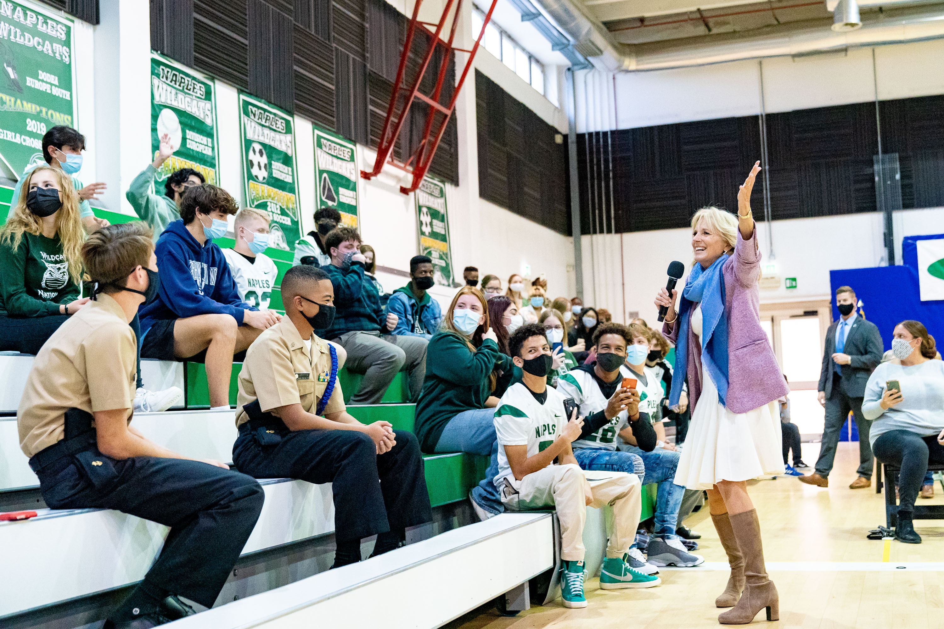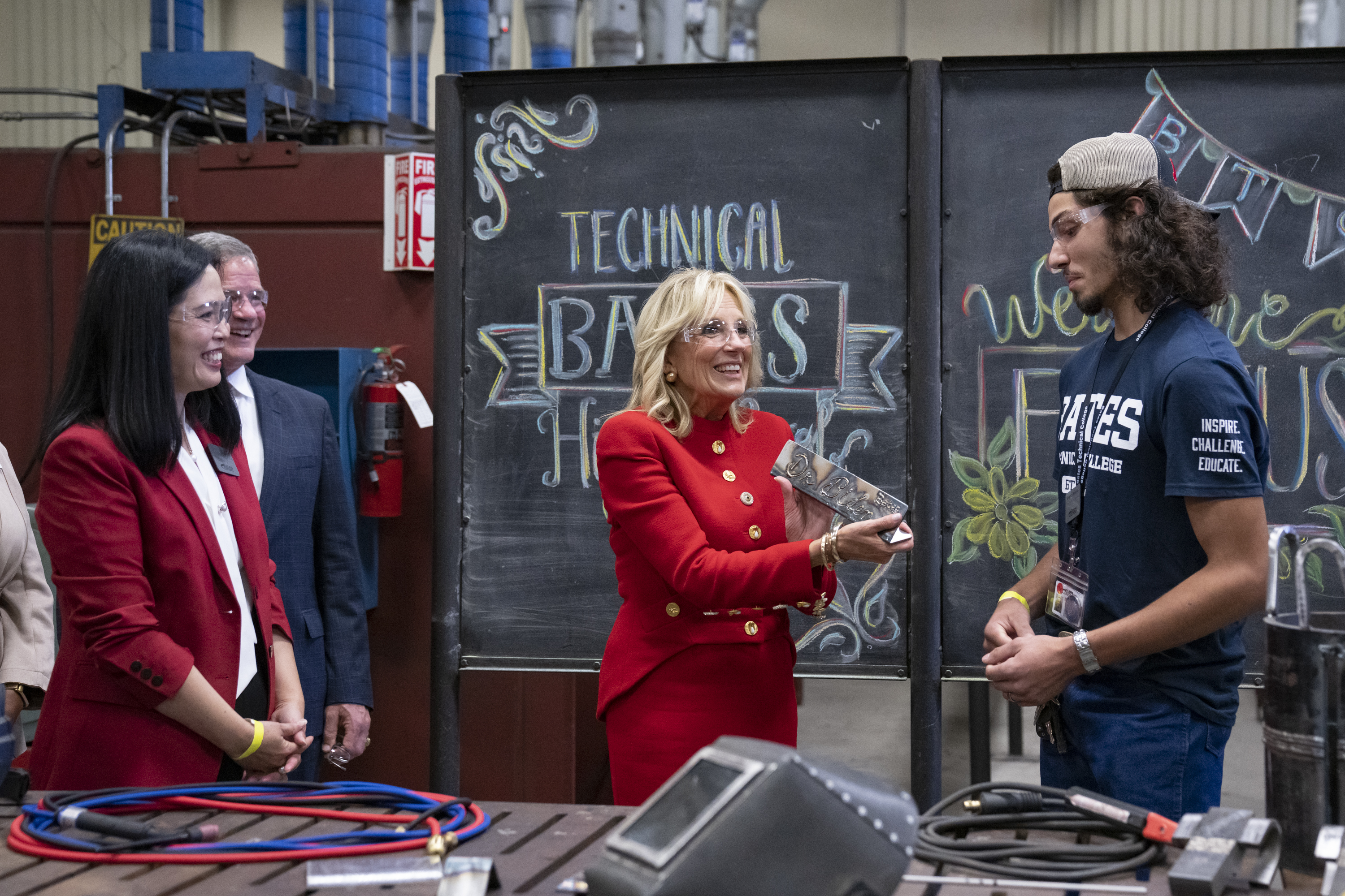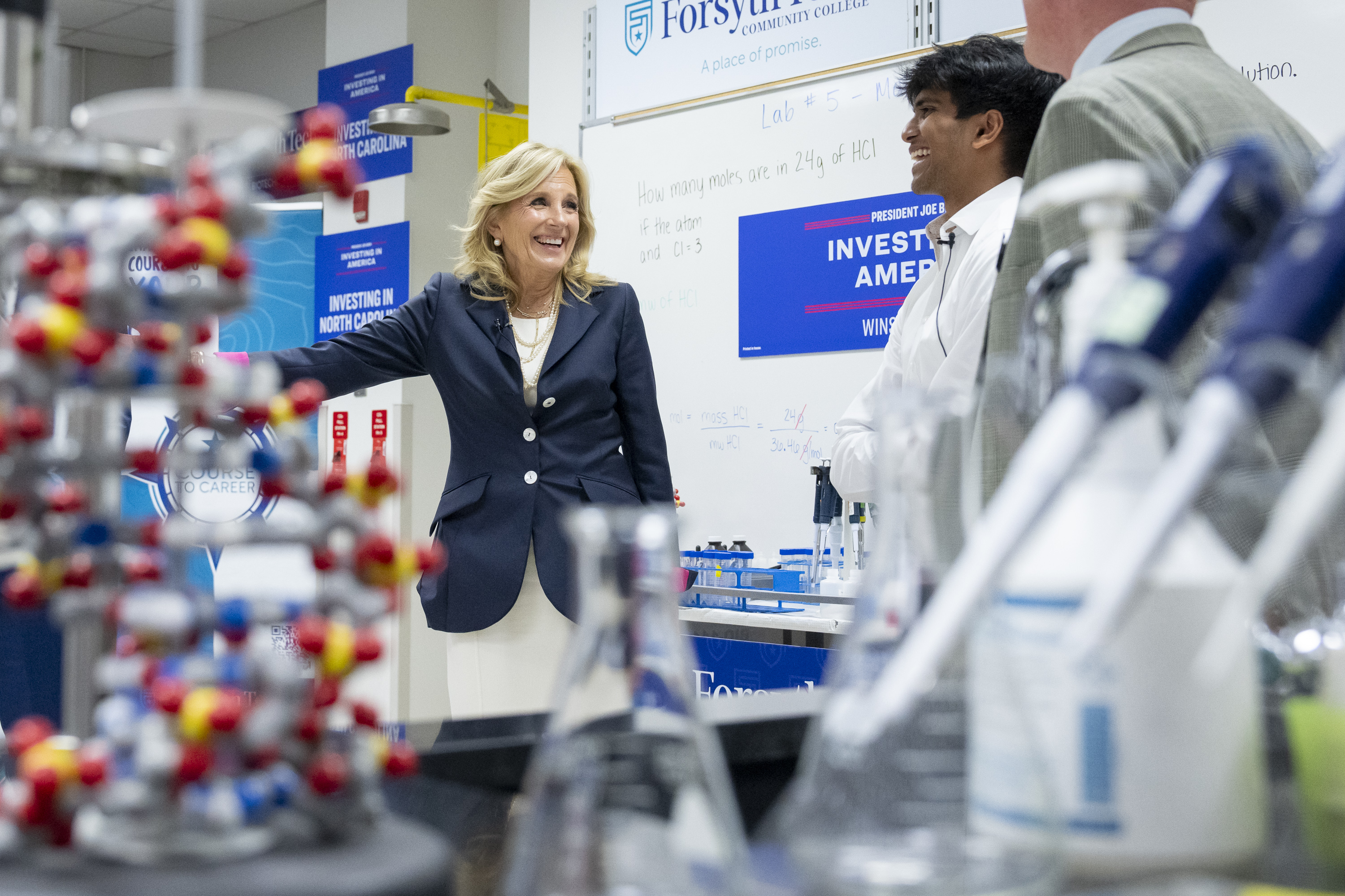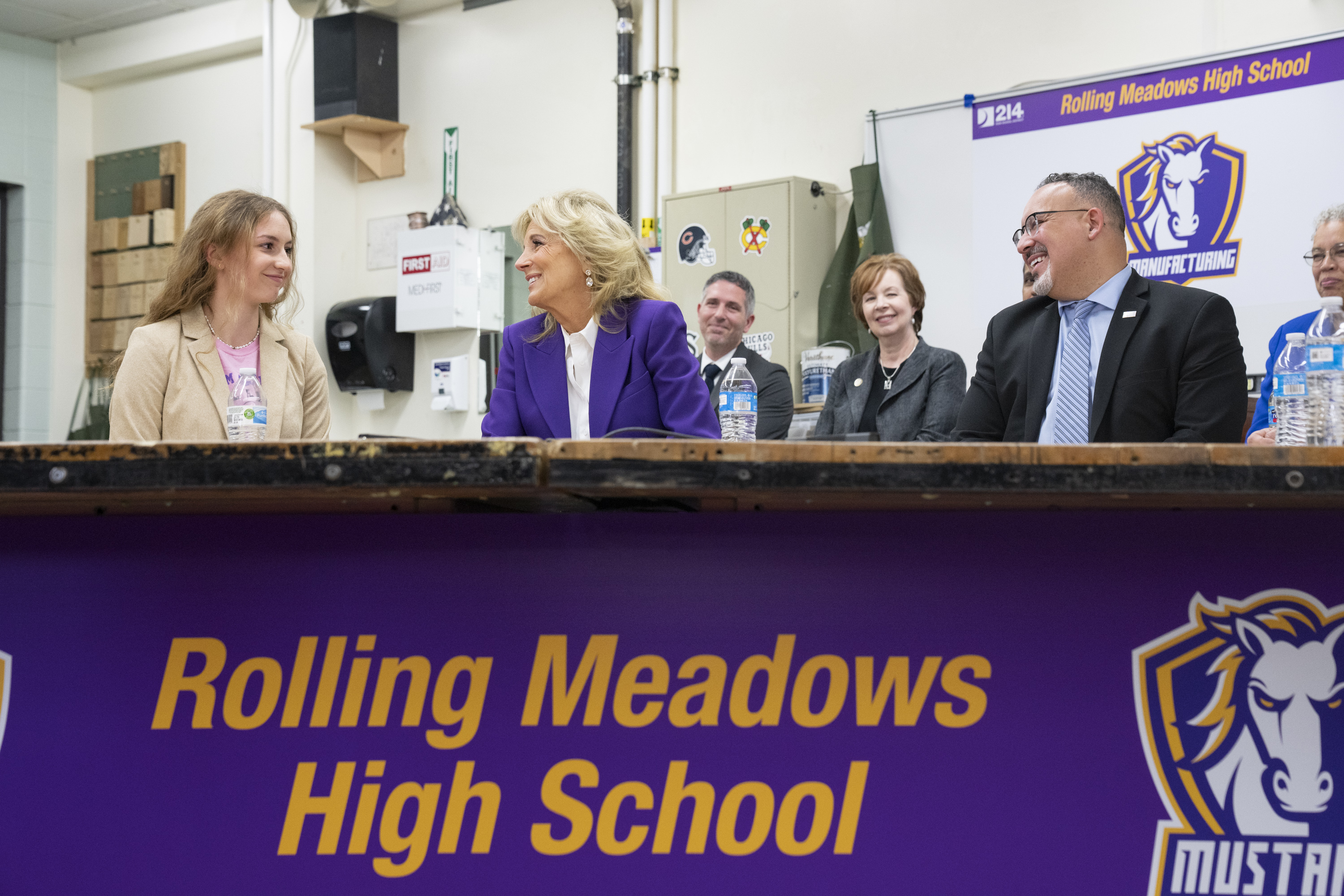 First Lady Jill Biden and Secretary Miguel Cardona visit Sauk Valley Community College in Dixon, Illinois to highlight affordable, accessible community college programs.