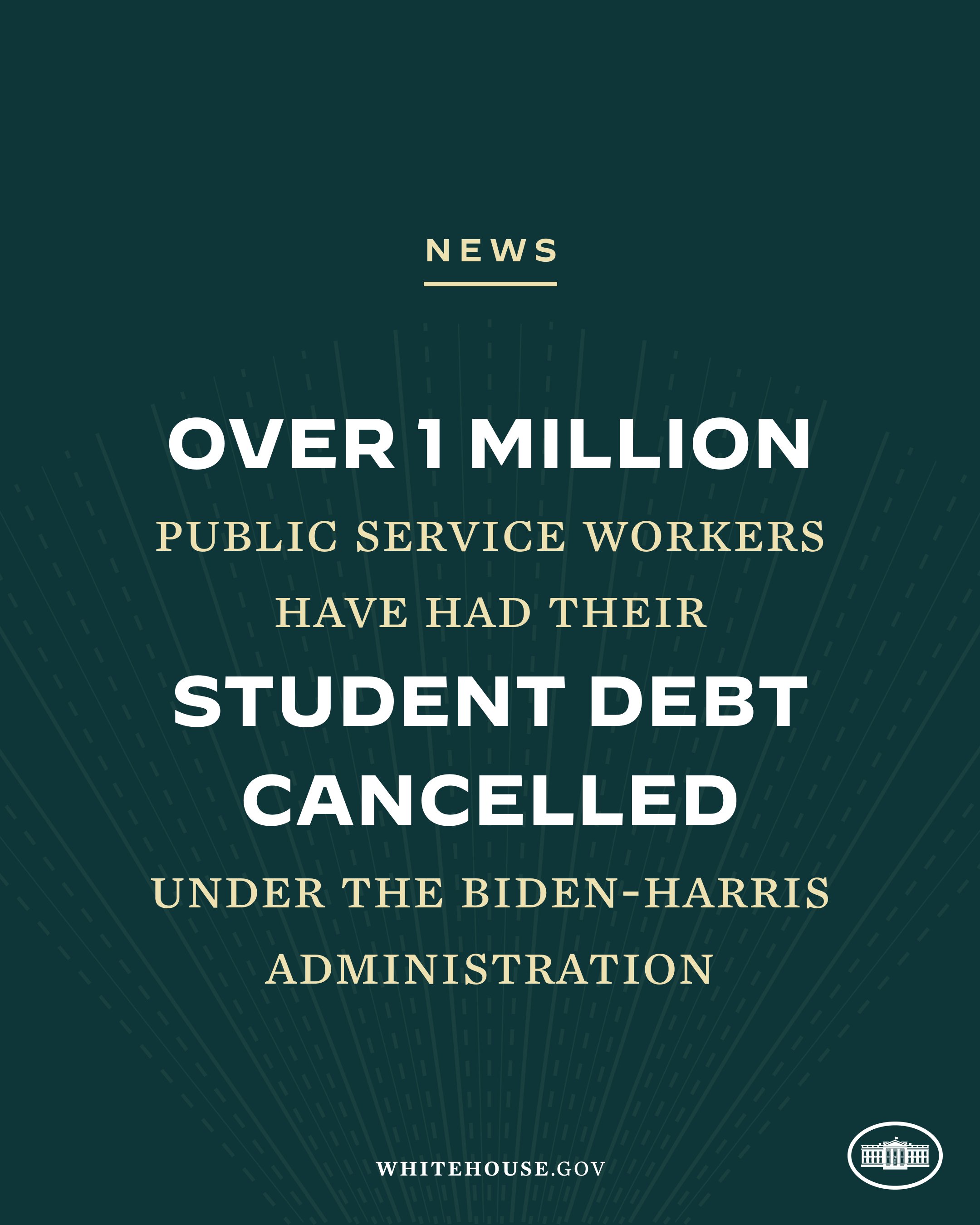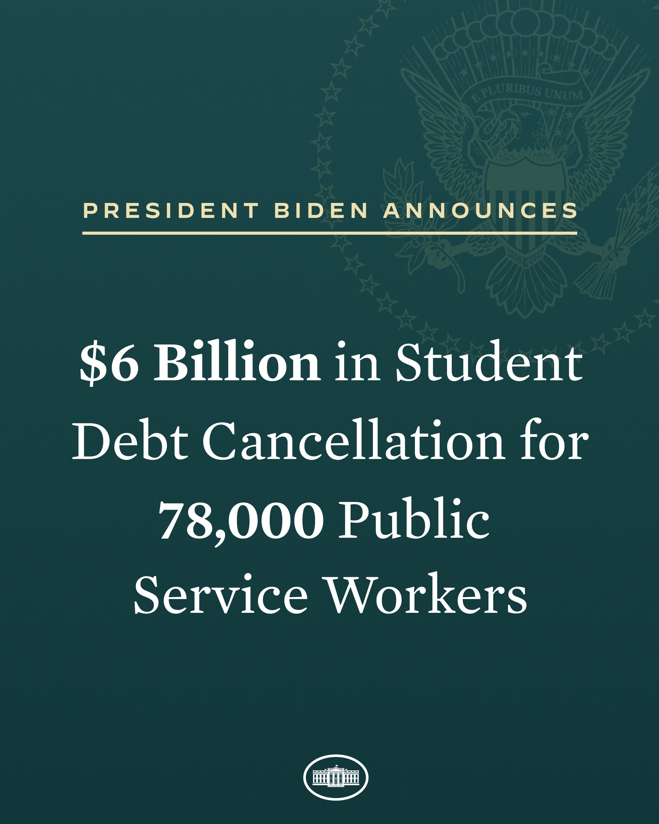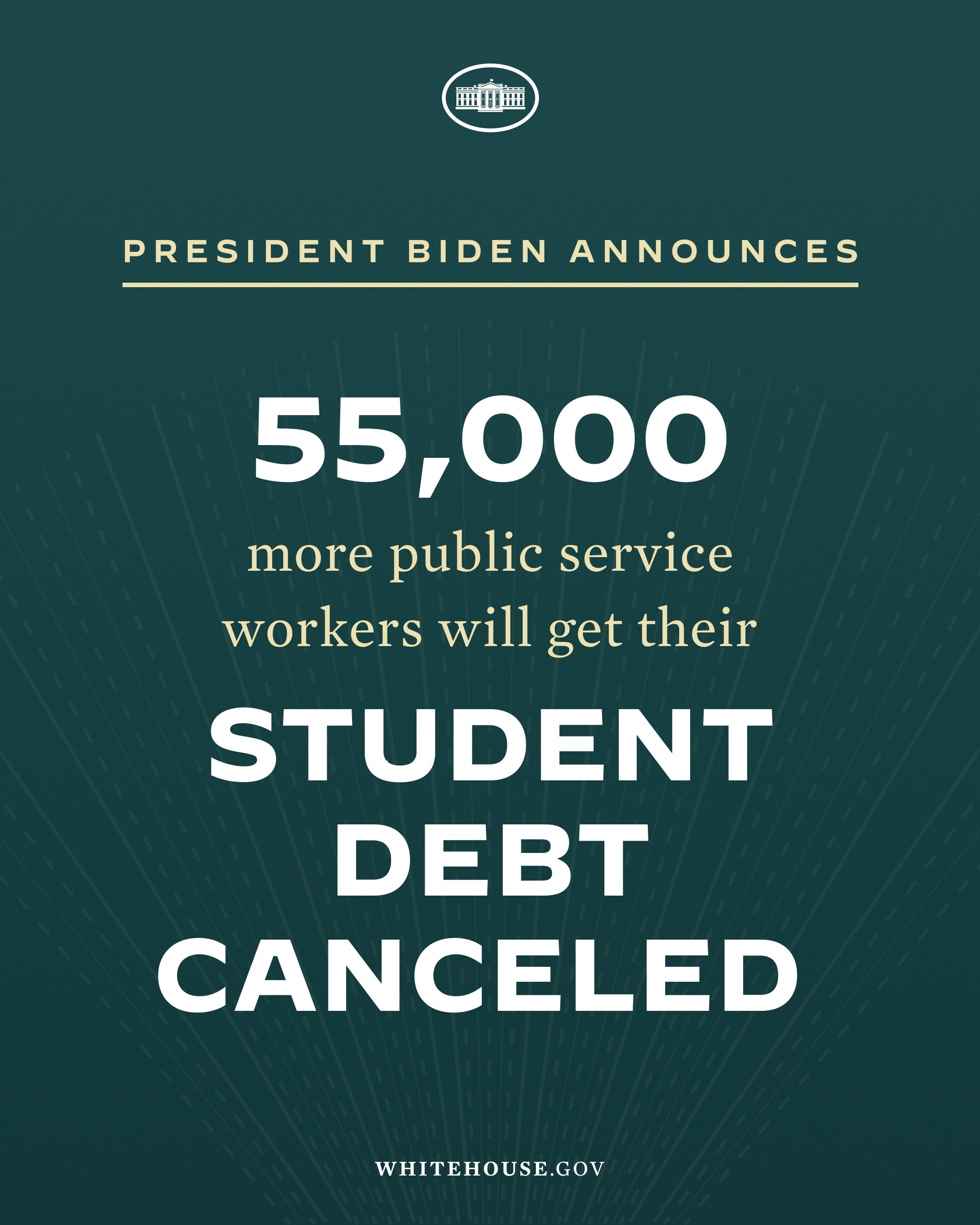 President Joe Biden announces student debt cancellation for an additional 55,000 public service workers – bringing total approved relief to nearly 5 million Americans through various actions.