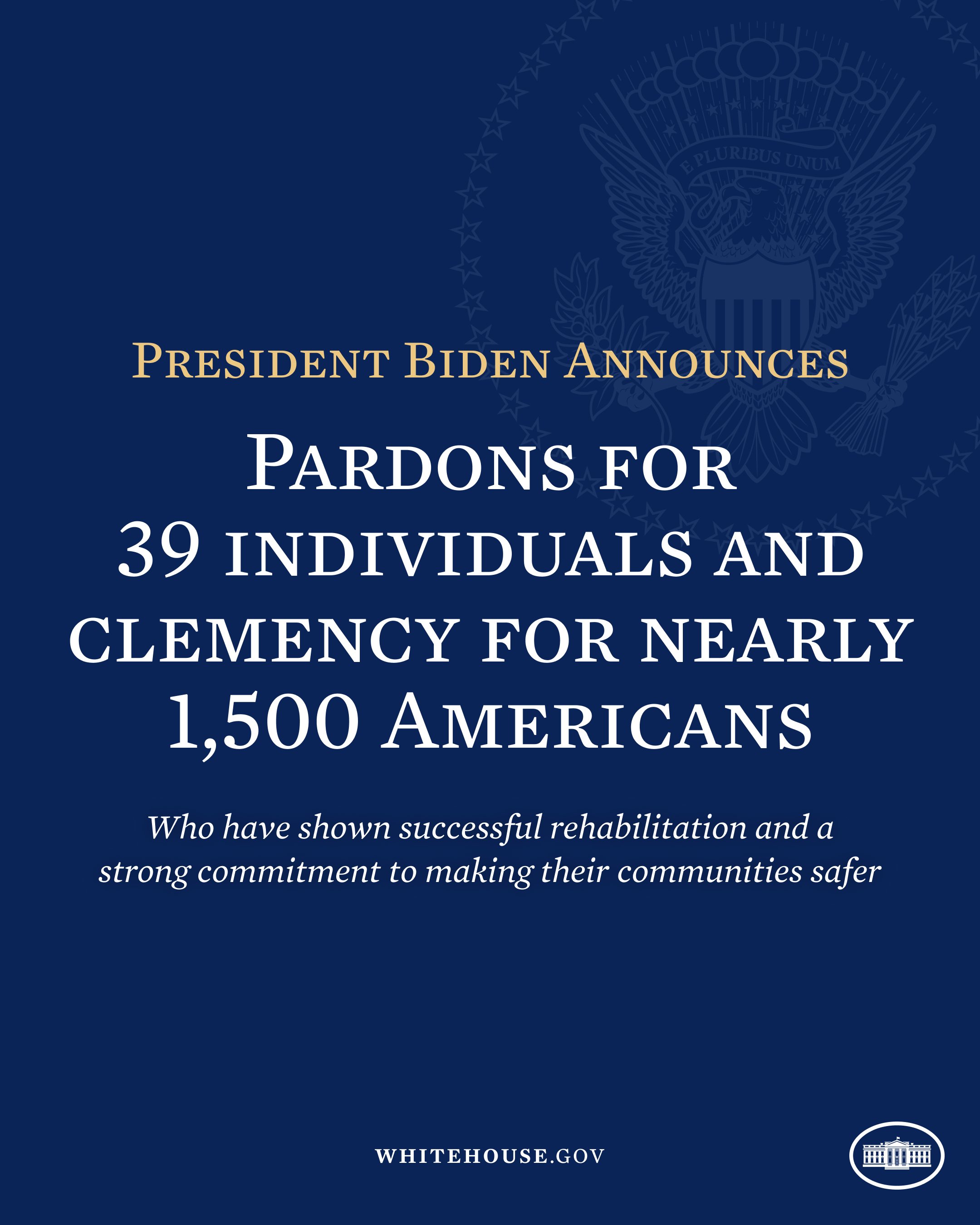 President Joe Biden pardons 39 people with non-violent crimes and commutes the sentences of nearly 1500 others.