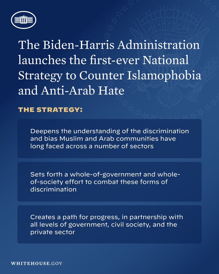 The Biden-Harris Administration releases the first-ever U.S. National Strategy to Counter Islamophobia and Anti-Arab hate.
