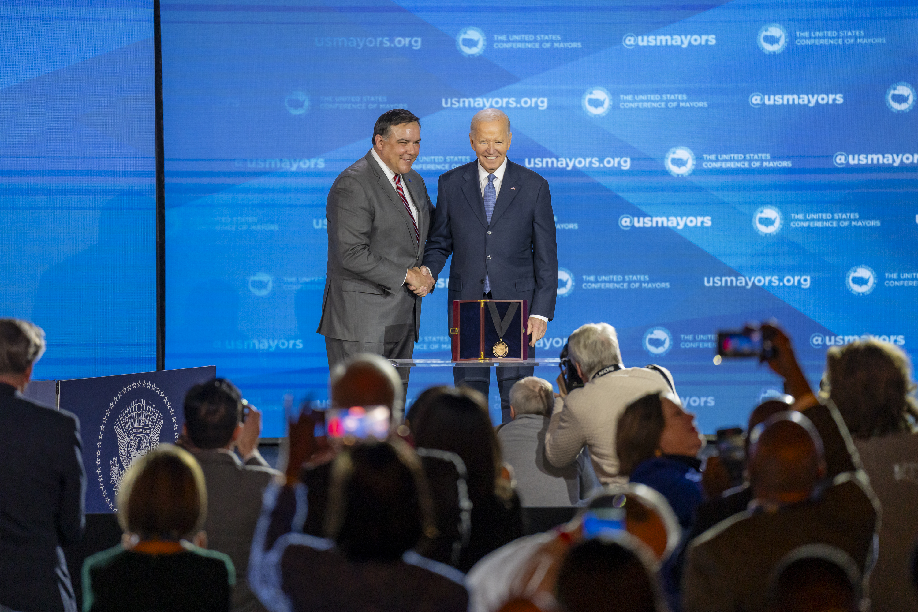 The President delivers remarks and receives an award at the U.S. Conference of Mayors.